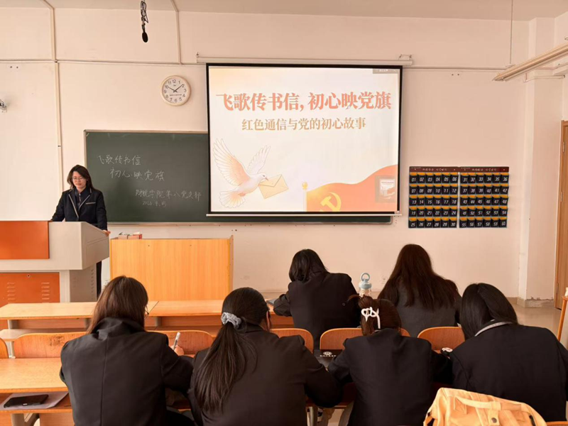 活动伊始,许刘鑫围绕“飞歌传书信,初心映党旗”主题展开讲述,结合红色微电影、红色歌曲、红色书信等鲜活教育素材,带领支部成员们重温党的光辉历程,感悟革命先辈的坚定信仰与初心使命,引导青年党员在光影与旋律中接受红色洗礼,在书信诵读中汲取奋进力量。随后,支部成员共同观看红色微电影、传唱红色经典歌曲、诵读红色家书,并围绕入党初心、学习成长与责任担当交流分享,畅谈感悟与体会。全体支部成员还面向党旗重温入党誓词,以铿锵誓言坚定理想信念,铭记党员使命,凝聚奋进力量。最后,许刘鑫作总结讲话。她重申了支部建设方向,明确后续理论学习与实践活动的衔接规划,鼓励支部成员将红色精神融入日常学习与实践,以实际行动践行党员使命、彰显青春担当。